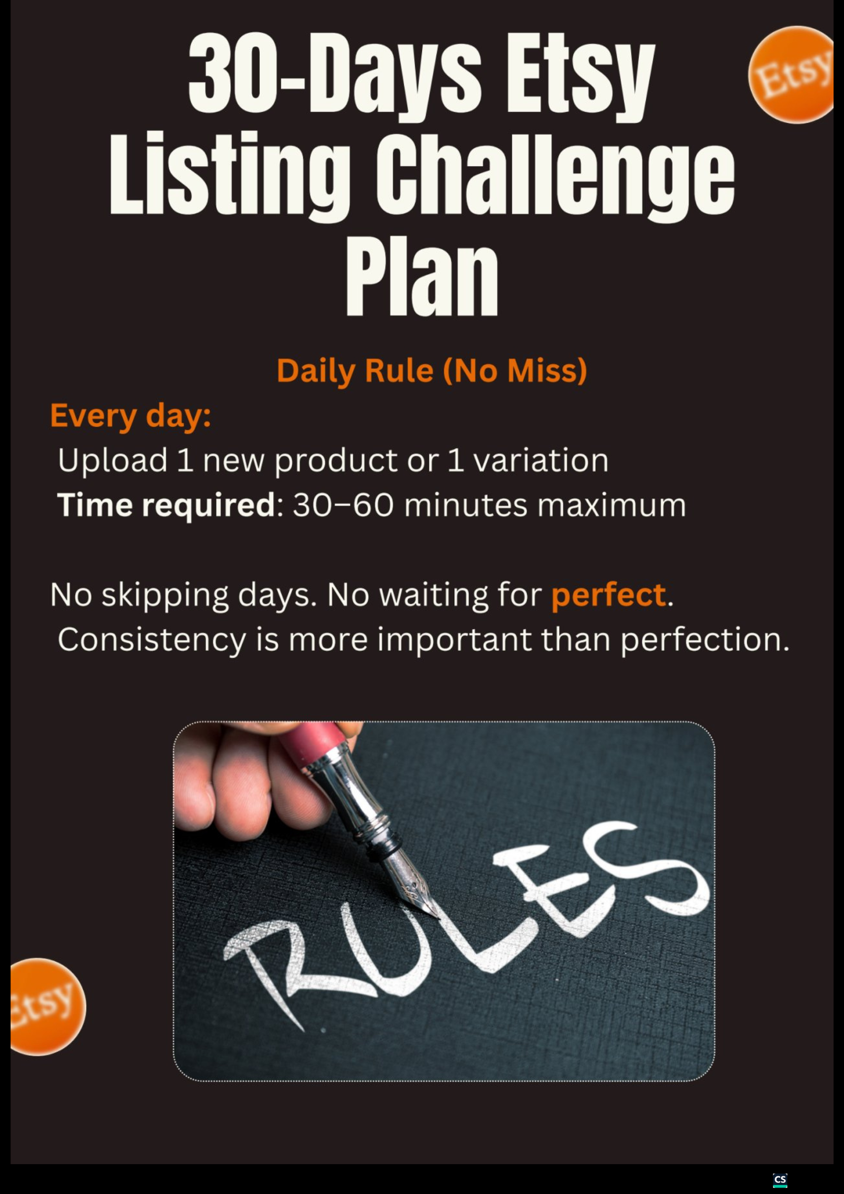 This 30-Day Etsy Listing Challenge Plan is designed to guide you step-by-step through improving, optimizing, and publishing high-converting Etsy listings — one simple task per day.