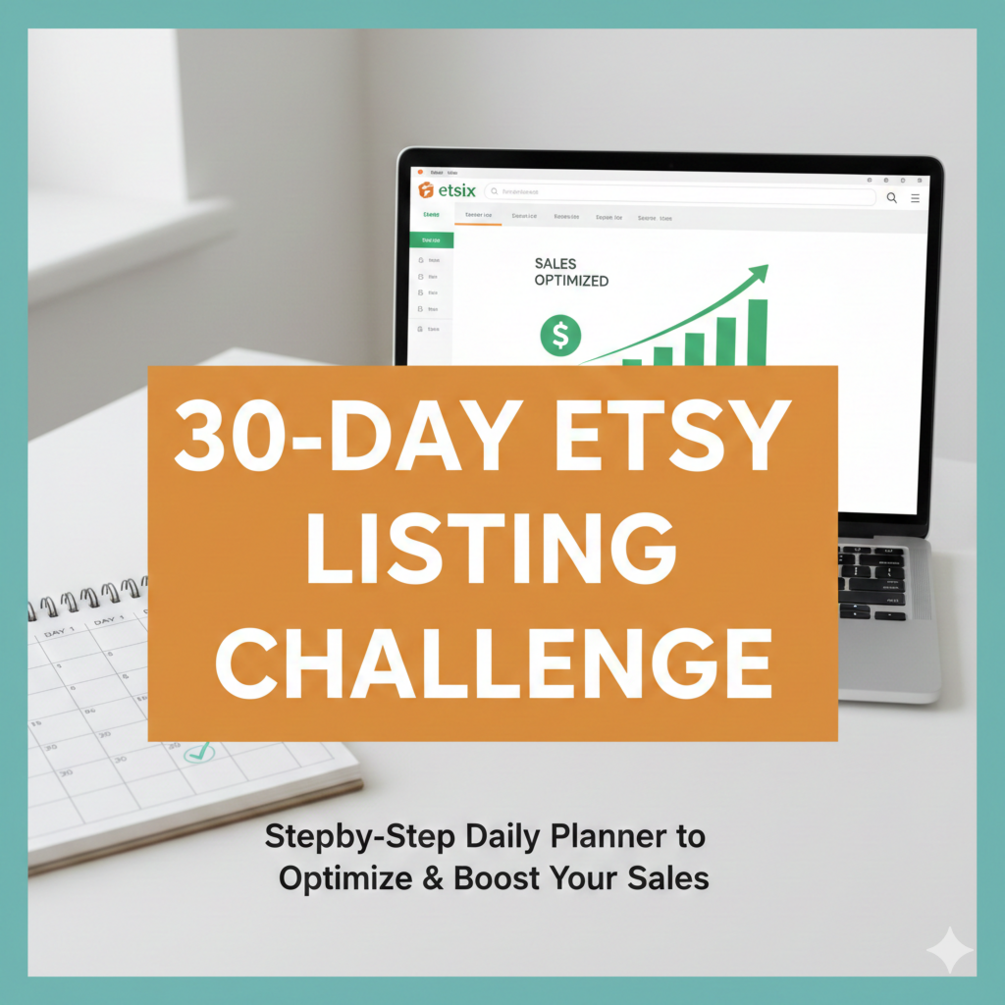 A 30-day step-by-step Etsy listing challenge planner to help sellers optimize listings, improve visibility, and increase sales.