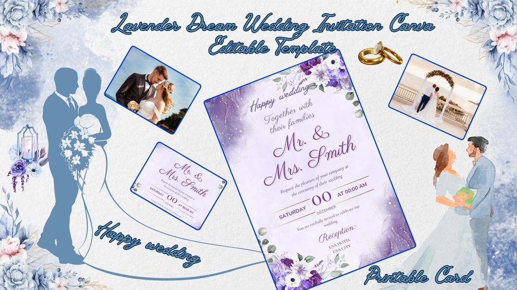 Soft,elegant,lavender-themed wedding invitation template fully editable in Canva.Includes a mockup frame so you can drag & drop your own photo instantly.Perfect for couples who want a dreamy,modern,and classy wedding card.